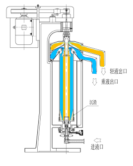 主軸帶動轉(zhuǎn)鼓繞自身軸線高速旋轉(zhuǎn),在轉(zhuǎn)鼓內(nèi)形成強大的離心力場。物料由底部進(jìn)料口進(jìn)入轉(zhuǎn)鼓內(nèi),在離心力作用下,迫使物料沿轉(zhuǎn)鼓內(nèi)壁向上流動,并依其密度差沿軸向形成兩個同心液環(huán)。輕液由靠近軸心的輕液口排出,通過輕液集液盤回收,重液由靠近轉(zhuǎn)鼓壁的重液口排出,通過重液集液盤回收,微量固體渣沉積在轉(zhuǎn)鼓內(nèi)壁上,停機后由人工清除。