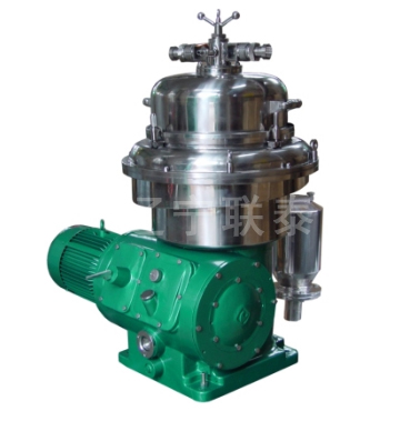 電機通過螺旋齒輪副驅動轉鼓繞主軸軸線做高速旋轉,在轉鼓內形成強大的離心力場。物料由上部中心進料管流入轉鼓底部,通過碟片分流孔趨向轉鼓壁空間。在離心力作用下,液相沿碟片內錐面趨向轉鼓壁流動至上部的出液口排出。比液相重的固相物沉積向轉鼓內壁形成沉渣,由排渣裝置自動排出機外或停機后由人工清除。